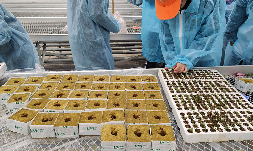 通过负责人的讲解,同学们了解了传统农业与现代农业的发展状况,同时明白了爱圃岩棉基质能通过精准种植,实现现代温室高产高质、节能高效、节水节肥等特性,十分契合现代农业的发展。理论与实践相结合才能发挥活动的最大效果。在负责人的示范下同学们动手操作了无土栽培从播种、移栽、扦插工序。